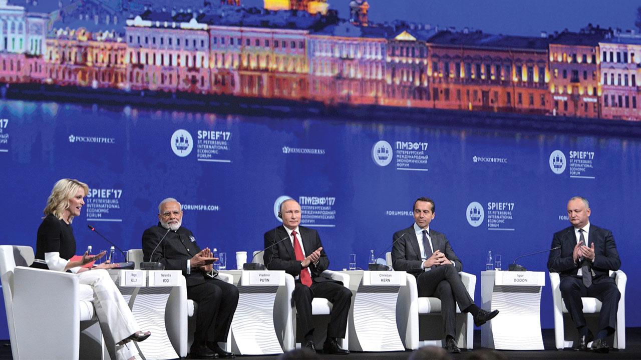 NBC's Megyn Kelly moderates a panel with Russian President Putin and Indian PM Modi Friday evening at the St. Petersburg International Economic Forum. |