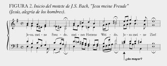 Déjenme mostrarles un ejemplo simple para ver qué tan incompetente es esta mentada teoría: un coral muy sencillo que Bach usa al principio y al final de su motete, Jesu meine Freude (Jesús, alegría de los hombres). En la figura 2, en el compás que indica la flecha, vemos, en la primera sílaba de la palabra "Jesu", lo que Rameau identificaría como un simple acorde perfectamente consonante en do, esto es, cuando lo tocamos o cantamos de forma aislada. Del mismo modo, Rameau identificaría las notas previas, al final del compás anterior, como un acorde perfectamente consonante en si natural.