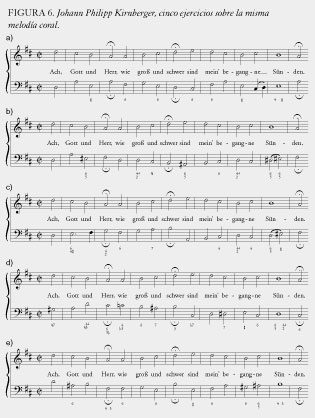 Ahora, la clave para el uso especial de la armonía de Bach es cómo cada voz cambia la manera en que se escucha cada una de las otras voces. Permítanme realizar una simple demostración pedagógica de esto, que hizo Kirnberger, el alumno de Bach (ver figura 6).