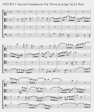 Naturalmente, también podríamos iniciar con una voz de bajo y, al agregarle diferentes voces soprano, transformar el significado del bajo. Así, es posible un verdadero diálogo y drama entre las voces. Escuchen, desde esta perspectiva, el inicio de la quinta fuga de El arte de la fuga de Bach, en donde el diálogo es especialmente claro. En esta fuga, el tema aparece junto con su inversión, lo que permite generar un nuevo conjunto de entrecruces de voces (ver figura 7).