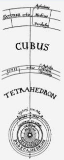 B: En pocas palabras, en su primer trabajo, Mystericum Cosmographicum (Misterio cosmográfico), Kepler desarrolló la forma más avanzada de hipótesis platónica: que nuestro sistema solar en general es formado, en todos sus aspectos, por un principio único; un principio físico que se refleja en términos geométrico–visuales en la existencia de exactamente cinco sólidos regulares en el espacio visual, derivados todos de uno sólo (el dodecaedro), tal como el maestro de Leonardo da Vinci, Luca Pacioli, lo demostró en su libro De Divina Proportione (La divina proporción).