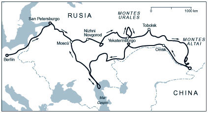 Entre sus anfitriones, estuvieron el doctor Benjamin Rush, importante físico y firmante de la Declaración de Independencia; el doctor Benjamin Smith Barton, principal botánico estadounidense y autoridad sobre la cultura indígena americana; el doctor Caspar Wistar, director del área de anatomía en la Universidad de Pensilvania, fundada por Franklin, y principal autoridad sobre fósiles en América; y Andrew Ellicott, importante astrónomo y matemático estadounidense. De inmediato, eligieron a Humboldt como miembro de la Sociedad y posó en una fotografía para el célebre doctor Charles Wilson Peale. Justo un año antes, Jefferson había ordenado que se capacitara a su secretario personal, Meriwehter Lewis, para lanzar la famosa expedición de Lewis y Clark. Rush, Barton, Wistar y Ellicott se encargaron personalmente de capacitar a Lewis en técnicas de trazo de mapas, botánica, astronomía y medicina. Cuando Humboldt llegó a los EU, Lewis y Clark ya iban rumbo al río Misouri en la primera parte de su travesía de tres años. Para los seguidores de Franklin en Filadelfia, los recuentos de los estudios y viajes de Humboldt por Centro y Sudamérica les parecían caídos del cielo y se emocionaban ante la posibilidad de que la expedición de Lewis y Clark abriera todo el occidente continental, pero al autor de la expedición misma, el presidente Jefferson, le parecía aún más grandioso. Jefferson invitó a Humboldt a la Casa Blanca para sostener conversaciones y consultas detalladas. Una abundante cosecha científicaHumboldt partió para el Nuevo Mundo con no menos de 40 paquetes con instrumentos. Traía los diseños más avanzados disponibles de la Ecole Polytechnique de París, y Humboldt sabía como usarlos. Algunas de las descripciones que hace Humboldt de sus viajes son divertidas y a la vez inquietantes; una de las razones de su gran popularidad años después. Pero la interacción de Humboldt con las corrientes de Franklin y Carlos III en la América hispana, produjo tal explosión de mediciones e hipótesis nuevas, que se convertirían en una de las más grandes cosechas científicas de toda la historia. Entre sus logros más notables, descritos en los 30 volúmenes que, o escribió directamente, o hizo que otros elaboraran basados en sus investigaciones y las de Bonpland, se encuentran: • La elaboración de la primera representación gráfica de la medición transversal de altitudes para grandes masas de tierra. • Sus escritos y esquemas gráficos para representar la distribución espacial de la flora por zonas ecológicas, que fueron revolucionarios (ver su ilustración del intrincado mosaico de zonas de flora a diversas altitudes del pico más alto del Ecuador, el Chimborazo). Precisó más la idea de que las altitudes mayores en los trópicos se asemejan a las latitudes ascendentes hacia los polos: viajar 50 millas desde la costa de Ecuador hasta la cumbre de los Andres, era el equivalente, en términos de zonas de fauna y flora, a viajar 5.000 millas al norte o al sur. • Fue el primero en Desarrollar la teoría y el uso riguroso de los isotermas e isobaras para representar geográficamente extensas mediciones barométricas y de temperatura a través del tiempo. • Entre los cientos de mediciones geomagnéticas importantes que hizo, descubrió el “ecuador magnético” en Cajamarca, Perú (donde la aguja de su magnetómetro oscilaba de norte a sur), estableció el valor raíz de las mediciones escalares geomagnéticas que se adoptaron a escala mundial, hasta que Gauss desarrolló una magnitud escalar absoluta en condiciones de laboratorio a fines de los 1830. Gauss prestó atención al abundante material de mediciones de Humboldt, y después trabajaron juntos en el establecimiento de la primera organización internacional encargada de recolectar información geomagnética, la Magnetische Verein (la Unión Magnética). • Humboldt también abrió líneas culturales e históricas de investigación. Sacudió a Europa al demostrar que las civilizaciones precolombinas habían sido civilizaciones avanzadas; que lo que parecían pueblos “primitivos” podría más bien reflejar la degeneración de culturas anteriores más avanzadas; que probablemente hubo un contacto transoceánico, en particular entre Asia y las Américas, en períodos que se remontan a varios miles de años atrás. Restituyó la imagen de Colón como navegante y explorador sin parangón, cuando la “Ilustración” denigraba la propagación de los modelos renacentistas de estadismo y científicos con tanta zaña como lo hacen ahora. El regreso a una Europa en guerraHumboldt tenía 34 años cuando regresó a Europa en 1804, de sus 5 años de viajes por el Nuevo Mundo. Regresó a una Europa sumergida en la guerra durante su ausencia, de la cual no saldría en 10 años más. Tras el Congreso de Viena en 1815, los regímenes reaccionarios instalados por Gran Bretaña y los paniaguados de Metternich en toda europa continental, trataron de aplastar cualquier actividad consistente con los ideales y el ejemplo de la lucha por la república de los EU. A Humboldt se le celebró en toda Europa por los exóticos sitios que visitó en sus arriesgadas exploraciones (en la prensa se informó de su muerte en varias ocasiones). Él escogió a París como su cuartel general durante los siguientes 23 años, a pesar de acusaciones de deslealtad a Prusia debido a las guerras napoleónicas. Pero Humboldt necesitaba los recursos intelectuales e institucionales que se concentraban en la círculos de la Ecole Polytechnique de París para publicar los 30 volúmenes de descubrimientos científicos y culturales de sus viajes. Al hablar ante una reunión expresamente convocada por el Instituto de Francia unos meses después de su regreso a Europa, Humboldt dijo: “Mi objetivo es recolectar ideas, más que objetos materiales. Una sola persona que, con medios moderados, emprende un viaje alrededor del mundo, debe limitarse