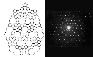 Luego, hace 15 años, sucedió algo muy sorprendente, algo que no pudo explicarse muy bien hasta ahora. Al someter a los rayos x a una aleación de aluminio–manganeso, cuya cristalización ocurrió con suma rapidez, se descubrió por primera vez una geometría cristalina pentagonal, algo que matemáticamente era imposible. Los cuerpos sólidos se han dividido estrictamente en amorfos y cristalinos, y ahora aparecía algo nuevo que no podía ser ninguno de los dos. La nueva sustancia no podía ser amorfa, porque mostró un orden interno global; no obstante, no podía ser un cristal, por su geometría pentagonal prohibida. A esta cosa "imposible" se le llamó entonces cristal semiperiódico o "cuasicristal".