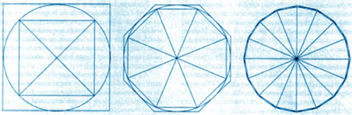 Todo esto se remonta a los supuestos básicos de la geometría plana euclidiana, que incluye el supuesto clave de que la suma de los ángulos internos de un triángulo siempre da 180 grados. El argumento es que, aún cuando tengamos algo que es aparentemente curvo, en lo muy pequeño en otras palabras, si el cuchillo para la salchicha es suficientemente afiladose puede hacer un corte tan pequeño de modo que no parezca curvo, sino casi recto. Por lo tanto, en lo pequeño, todo es lineal, y todo se puede reducir de esa manera. Mediante razonamientos similares, los matemáticos escolares sostienen que, de hecho, se puede cuadrar el círculo, es decir, construir un polígono de igual área que un círculo dado, simplemente añadiendo más y más lados un polígono inscrito en un círculo, ad infinitum. En resumen, lo que tenemos, en palabras de LaRouche, es una multiplicidad espacio-temporal cuádruplemente extendida. Las cuatro dimensiones son las tres dimensiones espaciales (delante-atrás, lado-a-lado, arriba-abajo), más la cuarta dimensión que es el tiempo, todos continuos, todos infinitamente divisibles. ![]() La "cuadratura del círculo": tratar de calcular la superficie de un círculo sacando el promedio de las áreas de dos polígonos regulares, uno inscrito y otro circunscrito.