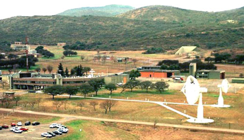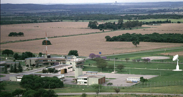 Centro Espacial Teófilo Tabanera. En el edificio principal de la Estación Terrena Córdoba se pueden apreciar las antenas fijas de telecomunicaciones sobre el techo del edificio y dos pequeñas antenas usadas para el seguimiento de los satélites NOAA. A la derecha sobre el terreno se puede apreciar la antena de 7 metros. La antena de 13,5 metros está fuera de la foto hacia la derecha.