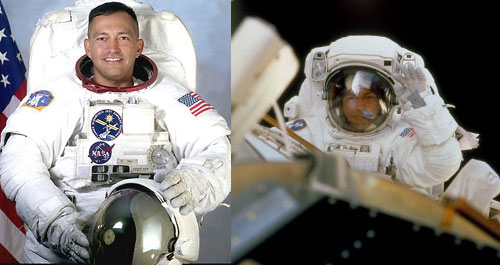 El astronauta peruano Carlos Noriega da una caminata espacial (izq.);