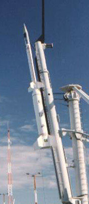 Cohete brasileño VLS en su plataforma de lanzamiento(ctro.);
