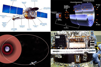 Ahora llegamos al presente, y de regreso a la imagen de la nebulosa del Cangrejo. Entre tanto, la revolución desencadenada por Kepler llevó a través del trabajo de Leibniz y sus colaboradores a una explosión de progreso científico y tecnológico, cuyos efectos pueden verse hasta el día de hoy. Los instrumentos que produjeron las extrañas imágenes que voy a mostrarles se basan en principios de diseño que fueron descubiertos gracias al trabajo de Kepler y de lo que vino después de eso. Esos instrumentos son una característica inseparable de la forma de sociedad industrial moderna impulsada por la ciencia, que se estableció en los Estados Unidos, Francia, Alemania y otras naciones en los siglos 18 y 19. Esa es la sociedad industrial que ahora se desploma a nuestro alrededor, pero por furtuna aún existe algún remanente de eso: expresado en la tecnología del viaje espacial, o en los extraordinarios instrumentos astrofísicos puestos en órbita alrededor de la Tierra. Tomemos, por ejemplo, el telescopio orbital de rayos x Chandra, el cual usa algunos avances nuevos en la óptica muy notables para enfocar y detectar rayos x (ver figura 8). A este telescopio Chandra tuvieron que ponerlo en una órbita elíptica para alejarlo del cinturón de radiación de la Tierra, que es muy ruidoso.