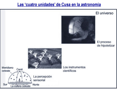 Platón desarrolla el concepto de las "dos medias" entre la percepción sensorial y el conocimiento en muchos pasajes de sus diálogos, incluso en el sexto libro de La República, donde debate acerca de los diferentes niveles de hipótesis en términos de proporciones geométricas. Fue precisamente este concepto platónico clásico, planteado y desarrollado en su máxima expresión en el trabajo de Nicolás de Cusa, que fue el que inició el Renacimiento del siglo 15. En su De Docta Ignorantia, y de forma más explícita en un escrito complementario titulado De Coniecturis (Sobre la conjetura, o Sobre la hipótesis), Nicolás de Cusa desarrolla esta noción de lo que él denomina las "cuatro unidades". La figura 6 brinda una imagen de las cuatro unidades de Cusa, tal como podrían expresarse con respecto al descubrimiento astronómico humano.