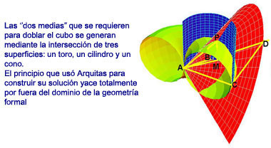 Sin embargo, en el caso del problema de doblar el cubo, resulta que no hay ninguna construcción en lo absoluto dentro de los procedimientos de la construcción geométrica establecidos por Euclides. No pueden doblar un cubo empleando procedimientos euclidianos. Los platónicos lo sabían, al igual que Arquitas, y se trata de un asunto muy crucial. El problema de doblar el cubo pertenece a un "poder" superior. Tienen que salir de los límites de la geometría formal y sus procedimientos, y generar un tipo de idea completamente diferente; una idea que no sólo sea geométrica en el sentido ordinario, sino que involucre una noción general de creación o generación.
