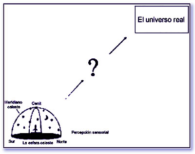 La figura 2 muestra el problema general planteado por lo que acabo de decir. En la esquina inferior aparece la noción de percepción sensorial, como ocurre en la astronomía: la llamada esfera celeste, con las estrellas y demás objetos astronómicos que vemos con nuestra vista. En la parte superior del diagrama está el universo real, que no vemos directamente. La pregunta es: "¿Cómo pasamos de la percepción sensorial al universo real? ¿Qué clase de proceso es ese?" Éste es precisamente el objeto de la epistemología, del modo que Platón lo desarrolla en su famosa "alegoría de la caverna" y en todos sus diálogos, donde habla de la esfera de las percepciones sensoriales como una especie de sombra de la realidad.