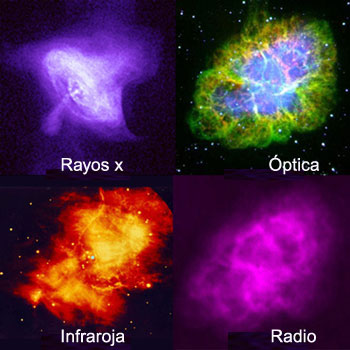 Ahora, apuntamos todos estos dispositivos a un punto de la esfera celeste, en el cual el primer astrónomo notó una nube luminosa difusa en 1731, una "nebulosa", que más tarde se conoció como la "nebulosa del Cangrejo". La figura 10 muestra imágenes generadas por cuatro instrumentos diferentes, que funcionan en cuatro rangos de longitud de onda diferentes de la radiación electromagnética. Tenemos nuestro telescopio de rayos x, que nos muestra la imagen de la esquina superior izquierda. Un telescopio que funciona con luz visible nos proporciona la imagen de la parte superior derecha. Un telescopio infrarrojo genera la imagen, muy distinta, de la parte inferior izquierda. Y, por último, un radiotelescopio nos da la cuarta imagen, que, de nuevo, es muy diferente, como aparece abajo a la derecha.