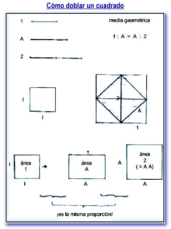 La figura 3 muestra el problema de doblar un cuadrado. Con un cuadrado dado, quieres construir otro cuadrado con exactamente el doble de superficie. Los geómetras griegos descubrieron que este problema puede resolverse si logras construir una longitud intermedia, llamada media geométrica, entre una longitud 1 y una longitud 2; una longitud A, para la cual la proporción entre 1 y A equivale a la proporción entre A y 2. De hecho, si observan la consabida solución para doblar un cuadrado usando diagonales, pueden ver, de forma geométrica, que la diagonal del cuadrado original es la media geométrica entre 1 y 2. Esto es patente en la similitud de los triángulos ABC y ACD.
