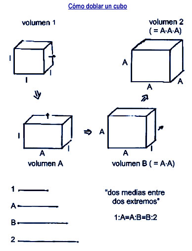 Al investigar el asunto de este modo, los griegos concluyeron que el problema de doblar el cubo equivale al de encontrar dos medias entre dos extremos 1 y 2; es decir, dos magnitudes A y B con la propiedad de que 1:A = A:B = B:2. Estas magnitudes son volúmenes de las dos "cajas" que acabamos de intercalar entre los dos cubos. De hecho, la primera caja tiene el volumen A, y la segunda el volumen B = A2.