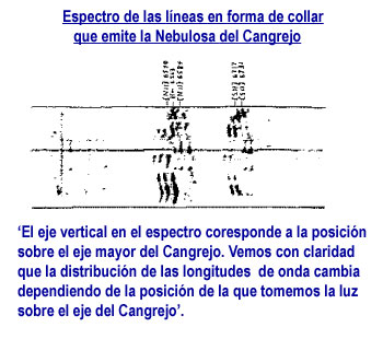 Luego, vemos el llamado espectro de la nebulosa del Cangrejo (ver figura 12). Esta no es una imagen fotográfica en el sentido ordinario, sino que se genera cuando hacemos pasar la luz proveniente de la nebulosa del Cangrejo a través de algo llamado rejilla de difracción, con la cual se divide a la luz en diferentes longitudes de onda. El eje vertical en el espectro corresponde a la posición sobre el eje mayor del Cangrejo. Vemos con claridad que la distribución de las longitudes de onda cambia dependiendo de la posición de la que tomemos la luz sobre el eje del Cangrejo. La gente quizá recuerde de cuando estudiaba en el laboratorio de química, que todo elemento químico, cuando se calienta, o se le excita de alguna otra forma, emite luz a longitudes de onda muy específicas que son características del elemento. Estas aparecen como líneas en un espectro. Pero en el Cangrejo descubrimos que ciertos grupos de líneas, típicos de ciertos elementos en el espectro del laboratorio, aparecen "duplicados", en dos copias. Un conjunto se mueve hacia las longitudes de onda más cortas, y el otro hacia las longitudes más largas.