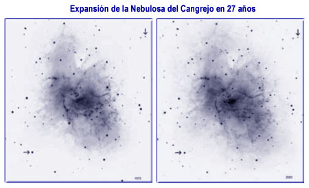 Ahora echémosle un vistazo a otra yuxtaposición de imágenes del Cangrejo; esta vez, dos imágenes de luz visibles tomadas en momentos diferentes (ver figura 11). Noten que las imágenes son en negativo, con la luz y la oscuridad invertidas). La primera imagen se tomó en 1973, y la segunda 27 años después, en el 2000. Observen ambas imágenes. Comparándolas con el fondo estrellado, ¡vemos que el Cangrejo creció! Y lo hizo a un ritmo de expansión de unos 0,2 segundos de arco anuales (un segundo de arco es la sexagésima parte de un minuto de arco, que a su vez es la sexagésima parte de un grado). Los indicios de esta expansión fueron descubiertos por primera vez en una comparación reciente con placas fotográficas tomadas en los 1920.
