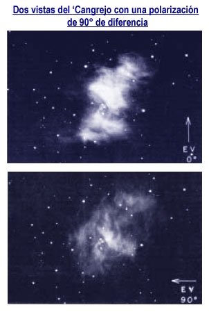 A medida que rotamos el filtro (en la figura 13) sólo se muestran dos posiciones), la imagen cambia. En particular, el Cangrejo es débil en una orientación y relativamente brillante en otra. Esto indica que toda la luz proveniente de diferentes partes de este objeto (presuntamente) gigantesco, tiene una orientación dominante común. Los astrónomos concluyen que toda la nebulosa del Cangrejo está sumamente magnetizada; otro reflejo de su coherencia y unidad.