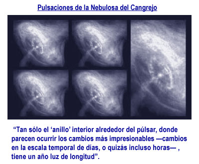 Lo que vemos es realmente asombroso y muy paradójico desde la óptica de las nociones convencionales de la causalidad física. El objeto cambia con rapidez, pero al mismo tiempo se supone que es inmensamente grande. Si comparan las imágenes, verán que los cambios ocurren de una forma al parecer sincrónica en todo el objeto, produciendo el efecto de ondas que se propagan a una velocidad prodigiosa. Y, no obstante, el objeto es tan grande ¡que tomaría unos diez años luz ir de un extremo al otro del mismo! Tan sólo el "anillo" interior alrededor del púlsar, donde parecen ocurrir los cambios más impresionantes cambios en la escala temporal de días, o quizás incluso horas, tiene un año luz de longitud.