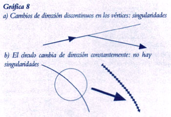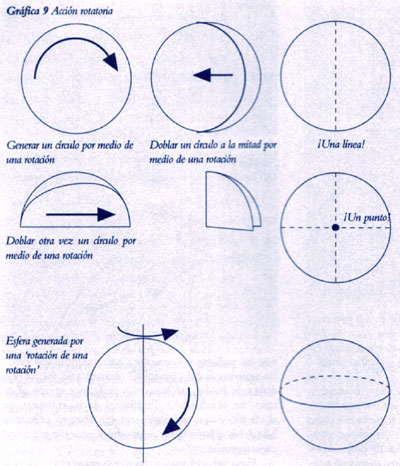 El perímetro del círculo, en cambio, cambia de dirección continuamente, y en ese sentido todos los lugares geométricos de la circunferencia son completamente equivalentes entre sí (ver la Gráfica 8b). De esa forma, la existencia de discontinuidad en los vértices distingue absolutamente al polígono del círculo. ¿Y qué pasa cuando aumenta el número de lados del polígono? Las discrepancias que representan los puntos de discontinuidad direccional crecen en número y densidad. Por ejemplo, tras duplicar cincuenta veces el número de lados a partir de un cuadrado, llegamos a una situación en la que un grado de arco del círculo correspondiente contiene ya más de diez billones de puntos de discontinuidad del polígono. Evidentemente, aunque las áreas de los polígonos se van aproximando a la del círculo en simple cantidad total, sus perímetros se apartan cada vez más desde el punto de vista cualitativo. Esto tal vez podría expresarse diciendo que hay un “no sé qué” muy delgadito que separa al círculo no sólo de cualquier polígono individual, sino del conjunto o suma de todos los polígonos habidos y por haber. Es algo que ni tiene magnitud expresable, al menos en el sentido común y corriente, pero de todas formas es algo que existe. Es de un grosor menor que cualquier cantidad medible, pero rehusemos decir que es cero. Podemos concebirlo como una zona de transición entre dos mundos, dos cualidades de existencia: de la poligonía a la circularidad. Es lo que llamamos una singularidad. Partiendo del mundo de los polígonos tan sólo podemos llegar a tocar esa singularidad, pero no podemos pasar por ella hasta el universo del círculo. Hasta aquí pareciera que las observaciones de Cusa son completamente negativas. ¿Está tratando de quitarnos lo que nos dejó Arquímedes? Pero agreguemos una última observación, y veremos que lo que acabamos de obtener es muy valioso: El hecho de que el polígono nunca puede llegar a ser círculo, ni siquiera con un hipotético “número infinito” de lados, nos fuerza a concebir en forma totalmente diferente el círculo y toda la geometría. Si el círculo es inaccesible desde el mundo de los polígonos, ¿de dónde proviene? Pues el círculo, en cuanto forma, es la simple huella de un movimiento circular que en sí mismo es resultado de la acción de rotación (ver la Gráfica 9). Y Nicolás de Cusa consideró el movimiento rotatorio como la única y más directa reflexión del ser es decir, del proceso de creación del universo mismo en el dominio visible de la forma y el movimiento. Esa correspondencia se demuestra, como posteriormente lo subrayó Cusa, por lo que se denomina la característica isoperimétrica o de acción mínima de la acción rotatoria.