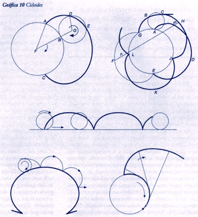 Ahora bien, si miramos el trabajo de Leonardo da Vinci en el diseño de máquinas, en anatomía, hidrodinámica y su concepto de ondas de luz y de sonido, etc., queda claro que Leonardo estaba impregnado de la concepción geométrica que apenas comenzamos a desarrollar. El desarrollo formal de una geometría fundamentada en la acción circular empieza mucho más tarde, con los trabajos de Christian Huygens, Gottfried Leibniz, y Johann Bernoulli. Dicho en las palabras de Leibniz, este trabajo “abre la fuente y el cofre del tesoro de las funciones no algebraicas”. Todo lo que se hace, en esencia, es descubrir un universo entero de formas o especies de movimiento, partiendo tan sólo de la acción circular. Este principio demuestra muy bien la construcción de Huygens de los diferentes cicloides. Tomemos un círculo y hagamos rodar por su circunferencia, ya sea por dentro o por fuera, un segundo círculo más pequeño (ver la Gráfica 10-a). Entonces, el movimiento de un punto fijo, cualquiera que sea, en el círculo pequeño, describe una curva, que en general se llama cicloide. ¿Qué pasa aquí? La curva se genera por dos especies simultáneas de acción circular: primero, el centro del círculo pequeño está girando en torno al centro del círculo grande; y, segundo, el círculo pequeño, a su vez, gira en torno a su propio centro. Obsérvese que cuando los radios de los dos círculos son conmensurables (es decir, que guardan relación de números enteros), entonces los cicloides cierran, y los puntos singulares, llamados cúspides, definen las posiciones de los vértices de los polígonos regulares. Quizás los polígonos debieran considerarse simples sombras de estas entidades superiores, los cicloides cerrados. Al mismo tiempo, vemos que la mayor parte de la aritmética elemental y la teoría de los números está contenida en la conducta de estos cicloides. Surge un caso interesante cuando los radios de los cicloides no son conmensurables; entonces las cúspides forman una serie uniformemente densa por toda la circunferencia del círculo grande (ver la Gráfica 10-b). Para el caso especial de un círculo pequeño que rueda sobre una línea recta, considerada ésta como el borde de un círculo “muy grande”, la distancia rectilínea entre cúspide y cúspide es igual a la circunferencia del círculo menor (ver la Gráfica 10-c). Con esto, quienes tengan alguna pericia en geometría verán fácilmente como “cuadrar el círculo”.
