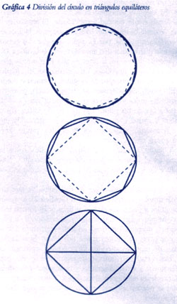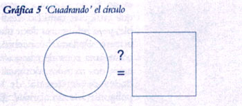 Otra anomalía tiene que ver con la división de un círculo mediante la inscripción de polígonos regulares, de lados iguales (ver la Gráfica 4). Es sencillo construir un triángulo equilátero en un círculo; también es fácil hacer un cuadrado, cuyos vértices dividen la circunferencia del círculo en cuatro arcos iguales. También podemos construir un polígono regular de cinco lados, el pentágono, aunque la construcción es de una forma curiosamente diferente, que sólo se puede entender a cabalidad desde un punto de vista más avanzado. El exágono, o polígono regular de seis lados, vuelve a ser fácil. Pero el que sigue, el heptágono, de siete lados, desafía completamente cualquier solución exacta con regla y compás. Aquí parece que nos topamos con un verdadero límite de la geometría euclidiana. Todo está íntimamente relacionado con otro famoso problema: la llamada cuadratura del círculo (ver la Gráfica 5).