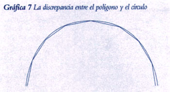 Arquímedes llamó a este enfoque el “método de exhaución”, y en realidad es fácil ver que el área del polígono muy rápidamente “llena” el área circular conforme aumenta el número de lados. El área restante el “error”, como lo hemos llamado, se reduce a menos de la mitad cada vez que doblamos el número de lados del polígono. Hipotéticamente, si se sigue lo suficiente por esta serie, se puede reducir el error hasta la mínima magnitud que queramos. Estrictamente hablando, sin embargo (y esto es lo que más mortifica), nunca se llagará en forma precisa a un verdadero error cero. Siempre hay una pequeña discrepancia, representada por los pequeños pedacitos en forma de media luna que quedan entre cualquier polígono y el círculo (ver la Gráfica 7).