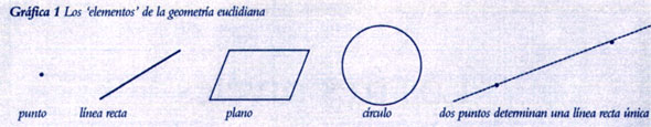 Además del punto, la línea recta y el plano, la geometría euclidiana introduce otro elemento: el círculo, que conlleva un concepto de longitud, distancia o medida. El círculo, considerando su circunferencia, pareciera consistir de todos los puntos que se encuentran a cierta distancia fija de un punto fijo que es el centro. En el espacio la forma correspondiente es la esfera. De esta manera tenemos estas especies de objetos: punto, línea recta, plano, círculo, esfera. Y ahora tratamos de contruir o explicar todas las formas en el espacio a partir de estos elementos. Esto conduce de inmediato a las famosas construcciones con regla y compás.