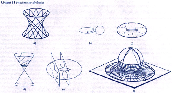Al aplicar las operaciones de involución y de rodar una curva sobre otra, a la totalidad de las curvas ya generadas a partir de un punto dado, se produce una nueva generación de curvas. Se crea una especie de proceso evolutivo. Pero observemos que la acción de rotación permanece en todos los casos como el “principio hereditario” subyacente al proceso de generación. Ahora, como ya lo subrayo Leibniz, las curvas de esta creciente familia no se pueden describir con los métodos del álgebra ordinaria. El álgebra fracasa ya desde el caso del cicloide más sencillo. Leibniz bautizó, pues, esta nueva familia con el nombre de curvas “no algebraicas” o “trascendentales”. La taquigrafía del álgebra sólo sirve si se introduce toda una serie de símbolos y operaciones nuevas, como las integrales y diferenciales de Leibniz. Pero no se puede explicar ni dar cuenta de ninguna dentro del mundo lineal del álgebra misma; uno siempre tiene que referirse al proceso de generación externo al álgebra, razón por la que el cálculo de Leibniz causó tanta conmoción entre los matemáticos, y la sigue causando hasta la fecha. Pero esto es apenas una primera muestra del cofre del tesoro de las funciones no algebraicas. Tomemos ahora un círculo y hagámoslo rotar sobre su diámetro; generamos una superficie: la esfera (ver la Gráfica 11-b). Fijemos un círculo pequeño en ángulo recto a la circunferencia de un círculo más grande. Hagamos girar el círculo mayor: generamos un toro (ver la Gráfica 11-c). Fijemos cualquier otra curva al círculo grande y hagámoslo girar: se crea el tipo general de superficie que se conoce como superficie de revolución. Esta nueva fuente de funciones trascendentales fue aprovechada especialmente por Gaspard Monge y sus colaboradores en la Ecole Polytechnique de fines del siglo 18. Por ejemplo, al rotar una línea obtenemos conos e hiperboloides (ver la Gráfica 11-d). Ahora tomemos cualquier superficie de revolución, y cortémosla con una serie de planos. La intersección de la superficie con cualquier plano es una nueva curva. Los que conozcan de geometría sabrán que al cortar un cono obtendremos, según el corte que decidamos, círculos de varios tamaños, elipses, parábolas e hipérbolas anchas o delgadas. Al cortar un toro, por ejemplo, por planos paralelos, se obtiene una familia de curvas de un orden superior que, hasta donde yo sé, aún no se les ha dado nombre (ver la Gráfica 11-e). Pero cualquiera de ellas se puede tomar como base para un proceso posterior de generación, formando superficies de revolución de ellas, o produciendo sus involutas. De esta manera, una sola curva puede generar, vía su superficie de revolución, toda una familia de curvas y nuevas superficies (ver la Gráfica 11-f); y así, ya las contiene todas en forma potencial. Si lo pensamos un poco, de veras es algo extraordinario. Baste lo dicho, a modo de rápida incursión en el mundo de las funciones no algebraicas. Antes de seguir en nuestra travesía, permítanme señalar que esta generación de curvas no algebraicas de un orden cada vez más elevado es al mismo tiempo una exploración de posibles diseños de máquinas. Tan pronto se introduce mediante la actividad de la mente, como lo hizo Cusa, el concepto de una nueva calidad de cambio, y el universo manifiesta su concordancia con experimentos cruciales de los que realizó Leonardo da Vinci y posteriormente, en el caso de la luz, Römer y Huygens, entonces ya estamos listos para una revolución tecnológica. Esto fue exactamente lo que ocurrió con el rápido desarrollo de las máquinas, anticipado por Leonardo da Vinci y que tomó vida explosivamente con la revolución industrial. Fue por esta razón que Leibniz y Huygens se refirieron a las funciones no algebraicas como “curvas mecánicas”: son curvas descritas por las piezas de máquinas. Existe mucho más que una simple analogía entre la generación de órdenes superiores de curvas y superficies, y el progreso de la tecnología. Reflexionando sobre esto, tenemos que preguntarnos: ¿Cuáles son los límites de este mundo de las funciones no algebraicas? Observemos primero lo siguiente: El universo de las funciones no algebraicas es uno en que el concepto de cambio conlleva una idea de movimiento. Pero también hay un concepto implícito de cambio de cualidad o especie de movimiento. Cuando se procura entender el universo físico desde el punto de vista del concepto de movimiento, es preciso dividir en especies las cualidades del movimiento. Una característica de las funciones no algebraicas es que se desarrollan por especies. Ya tuvimos un atisbo de ello en la distinción que hizo Cusa entre los polígonos y el círculo. La elaboración de las curvas no algebraicas lleva a una gran multiplicidad de nuevas especies de funciones, y ocasiona una pregunta de mayor alcance: ¿Será posible enumerar esas especies mediante algún tipo de función? En otras palabras, supongamos por un momento que el concepto de la acción circular multiconexa, eleborada en las formas que he indicado, cubre todos los modos de cambio en el espacio-tiempo físico. ¿Podrá ahora definirse ese espacio-tiempo mediante una función que incluya todas las cualidades o especies de movimiento generados por la acción circular? También preguntamos: ¿Es posible que haya otro tipo de cambio en nuestro universo que no sea el movimiento sino que podría ser la causa más inmediata del movimiento y del cambio en la cualidad del movimiento? Con esto ya entramos en el problema del llamado campo cuántico. Teoría de Funciones El intento de abarcar toda la gama de posibilidades de las funciones no algebraicas y establecer sus relaciones desde el punto de vista de la especie, se llama teoría de funciones. Carl Gauss y Bernhard Riemann , en particular, lograron llevar la teoría de funciones hasta el punto en que llegó Georg Cantor a transportarnos, con su extraordinaria intuición, al mundo