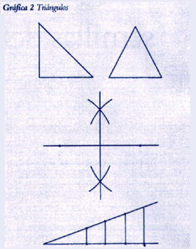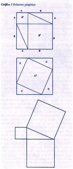 Construimos varias clases de triángulos, ya que son las más simples de las formas (ver la Gráfica 2). Después, rectángulos y polígonos de varios tipos, y las formas sólidas correspondientes. Examinamos las relaciones de proporción y magnitud, primero en tanto segmentos definidos por pares de puntos sobre una línea. Inventamos formas de reproducir o dividir cualquier segmento en dos, tres o cualquier número de segmentos iguales, para poder sumar y restar longitudes y multiplicar y dividirlas según las leyes de la proporcionalidad. Todas estas operaciones se pueden expresar mediante una taquigrafía llamada álgebra. Luego pasamos a las áreas y volumenes . Descubrimos relaciones tan bellas como la que se atribuye a Pitágoras, que se refiere al área de los cuadrados formados en los lados de un triángulo en que uno de sus ángulos es recto, y que se puede demostrar dividiendo un cuadrado grande de dos formas diferentes (ver la Grafica 3). Y así, vamos avanzando.