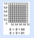 Bueno, ¿cuánto es 8 por 8? Todos saben que es 64. Y 9 por 9 es 81. Puedes ver cómo funciona esto en el cuadrado grande, moviendo tu índice sobre la base (o la parte superior) del cuadrado grande, 9 cuadritos, y el otro dedo, comenzando desde el mismo punto y hacia arriba (o hacia abajo), 9 cuadritos, y coloreando el área del cuadrado que cubriste.