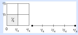 Además, ahora vemos que las raíces cuadradas vienen en pares iguales y que se construyen como los dos lados de un cuadrado. Y vemos que es imposible construir un cuadrado, sin al mismo tiempo también construir sus raíces cuadradas, las cuatro, tomando dos a la vez, ¡de la forma que quieras! Pero hay algo más. Observa el lado del cuadrado que dividiste a la mitad dos veces (1/2 por 1/2). ¿Podemos dividir el lado de 0 a 1/2 a la mitad? Sí, esto nos da 1/4; Y podemos terminar el proceso dividiendo el lado de 1/2 a 2/2, para producir 3/4.