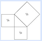 Hagamos esto abordando un problema aún más interesante: el temible teorema de Pitágoras (¡gulp!). Este problema ha existido por varios miles de años, y quizás tu biblioteca tenga muchos libros sobre la historia de Pitágoras, su escuela y sus estudiantes. Algunos de ellos están llenos de dibujos interesantes, y (a veces) ecuaciones y fórmulas algebraicas que parecen muy complicadas. Pero juguemos un poco con lo básico. Primero, regresemos al problema de 1/2 × 1/2 y coloquemos algunos cuadrados en nuestro punto cero, como muestra la figura.