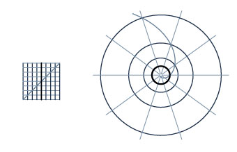 La proyección de Mercator corresponde a una transformación de círculos y líneas radiales distribuidos de forma homogénea en un entramado de líneas. Los radios se transforman en líneas verticales distribuidas de forma homogénea, y los círculos en líneas horizontales distribuidas de modo exponencial. Esto corresponde al inverso de la exponencial compleja, también conocida como el logaritmo complejo (ver figura 8). Para proyectar una esfera sobre un plano, Gauss aplicó estas transformaciones complejas a los modos de determinación de una esfera, esto es, a los dos modos de rotación.
