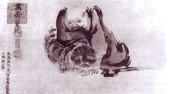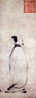 En “los dos patriarcas armonizando sus mentes” de Shi Ke (periodo de las Cinco Dinastías), el carácter diferente de los dos sujetos se expresa a través del uso del pincel y la variación en la “humedad” de la tinta. Un método similar, aunque más simplificado, es usado por Liang Kai en “Li Bai cantando un poema”, pintado cientos de años antes, durante el periodo Song.
