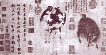 Con sólo unos pocos trazos, el artista ha capturado el espíritu del famoso poeta Tang, Li Bai (Nota(*6).- La primera conexión directa entre poesía y pintura se encuentra en los poemas escritos por los poetas Tang, Li Bai (701-762 d.C.) y Du Fu (712-770 d.C.) quienes escribieron poemas después de inspirarse con una pintura. En el periodo Song del Norte, el pintor y poeta Su Shi ( 1036-1101 d.C.), y otros, promovieron la combinación de éstos dos artes, de forma tal, que con el paso del tiempo, la poesía y la pintura llegaron a integrar ese “poema silencioso”, desarrollando una expresión común para la pintura. Un libro de pintura de la Dinastía Qing lleva el título: “Una historia de los poemas silenciosos”). Otro uso magistral de la tinta se despliega en “cabra y oveja” de Zhao Mengfu,(Dinastía Yuan), donde el artista ha “dosificado”, suaves y húmedos tonos para crear la textura de la lana de la oveja, en notable contraste con los largos cabellos como agujas de la cabra, logrados con el efecto de la tinta seca.