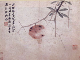 Sobre esta pintura de la granada, Shen Zhou ha escrito los siguientes versos: ¿Quién pudiese partir la granada Sobre la pintura “coraza amarilla” de Xu Wei ( Dinastía Ming), el pintor ha escrito el siguiente poema: La cosecha de arroz ha concluido, es temporada