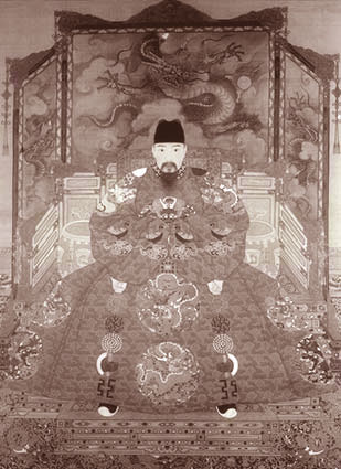 Aquí, cerca de 550 años después de su muerte, el emperador Taizu el fundador de la Dinastía Song, es retratado una vez más, y si comparan su cara con la pintura previa, pueden ver que se trata de la misma persona. El emperador le ha pedido a Zhao Pu ( quien aparece en “grupo de jugadores de pelota”) que lo visite para discutir importantes asuntos de estado. Zhao Pu no era un hombre cualquiera. El llegó a ser primer ministro, y es conocido por propiciar la paz y la prosperidad de China aplicando las enseñanzas de Confucio. Un ejemplo muy diferente se encuentra en el retrato formal del Emperador Hungzhi (reinó de 1488 a 1505 d.C), el segundo emperador de la Dinastía Ming. No es tanto la representación de una persona, sino la institución del trono imperial. El emperador está ataviado con una solemne túnica amarilla, la cual tiene grabadas imágenes simbólicas relativas a su posición. La institucionalización es tan grande, que parecería que su túnica forma parte del piso.