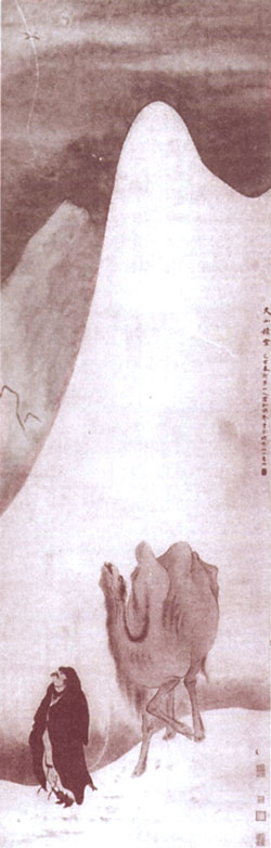 Un búfalo ha doblado su cuerpo, y voltea hacia el segundo búfalo, creando una perspectiva entre ellos, mientras que los dos niños voltean en direcciones contrarias, generando una especie de tensión. El niño que va en punta se concentra en sostener su sombrero y llegar a casa, mientras que el otro niño ha girado completamente su cuerpo, para ver el sombrero que el viento le ha lanzado por los aires. A través de su composición ingeniosa, el artista ha creado una pintura plena de qi shi y humor. Comparen ésta con “Nieve en el Monte Tian” pintado por Hua Yan de la Dinastía Qing. Aquí, un mercader camina en soledad con su camello a través del hielo y la nieve en el salvaje norte de China. Porta un sombrero de piel, una espada al cinto, y un abrigo rojo brillante, el cual contrasta con el cielo gris, el camello café y la blanca nieve.