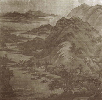 Vean la pintura y entonces lean el siguiente verso del poeta Chen You-yi (Dinastía Song): Las aguas del largo río colman nuestra mirada, Somos testigos, cómo la manipulación del espacio es afín a la poesía como a la pintura.(*14) “Shan Shuí” El término Chino de la pintura de paisaje es “Shan Shuí hua”, Shan significa “montaña”, Shui significa “agua”, y hua, “pintura” [ver recuadro]. En la filosofía Confucionista, las montañas son una imagen de la calma silenciosa, y el agua, de movimiento y cambio (por tanto, de los conceptos complementarios de Ser y Devenir). Así que, el artista diestro puede usar sus obras para dirigir y retratar las transformaciones y genialidades del universo.