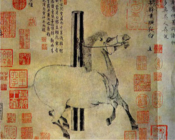 Hay muchos ejemplos de cómo se expresaban a través de las pinturas, ya sea indirecta o no tan indirectamente, la oposición a un régimen represivo, comunicándolo mediante paisajes, flores o animales. Quizá por estar cubiertos de un denso simbolismo, las ideas comunicadas en estas pinturas son a menudo limitadas. Aquí algunos ejemplos: El Emperador Minghuang (712-756), que aparece en una de las anteriores pinturas, tenía un estilo de vida algo indulgente. Entre sus excesos, llegó a reunir en sus establos mas de cuarenta mil caballos extranjeros. Esos caballos no se usaban en el combate, sino que eran entrenados para bailar para El Hijo del Cielo, o sea, el Emperador. “La brillante luz de noche”, pintado durante la Dinastía Tang, representa a uno de los más queridos caballos del establo del Emperador Minghuang, pero vean a éste en la figura. El caballo no está contento ni feliz. El caballo forcejea violentamente, azotando sus pezuñas y levanta su cabeza, dirigiendo un ojo suplicante hacia el espectador, pero todo es en vano. Está amarrado a un grueso madero, cuya posición central en la pintura contrasta con el intenso forcejeo del animal. Aunque de forma indirecta, la pintura parece ser una condena a la corte.