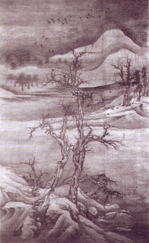 Un noble sentado en su pabellón de seis picos. Frente a la puerta del pabellón, cuatro pares de lámparas delinean el camino. Es tarde, la luna llena brilla en la claridad del cielo, y el lago empaña suavemente el contorno de las montañas.(*10). Suspendidos, casi flotantes, los manzanos en flor envuelven el pabellón. “Paseo nocturno con lámparas” es la representación de los siguientes versos de Su Shi [ver nota *6] Temo que en el profundo anochecer Las “tres perfecciones”, san jue: pintura, poesía y caligrafía. En otra pintura de Ma Lin, “paisaje de una puesta de sol”, el artista ha creado una composición muy simple: algunas golondrinas vuelan sobre el agua en dirección al crepúsculo. [ver figura]. A lo lejos, las montañas que se pierden entre la bruma nos dirigen la mirada hacia el cielo resplandeciente del fondo, donde el pintor ha escrito las siguientes frases poéticas del poeta Wang wei de la Dinastía Tang: Las montañas casi absorben los colores del otoño, Esta combinación conocida como las “tres perfecciones”, san jue, desarrolla un campo muy amplio para que los artistas Chinos jueguen con las ideas. A través de las pintura-poema combinadas, el artista puede crear ironías y contrastarlas no sólo dentro de la pintura, o dentro del poema, sino también componer una triple interacción entre el poema y la pintura con la pintura misma, desarrollando un nuevo campo para las ideas. Pero esto toma nuevas fronteras, porque el rumbo que adquiere con la caligrafía, la tercera “perfección”, es ejecutada de tal forma, que la idea de la pintura sea concebida como un todo.(*11) Las siguientes dos pinturas son ejemplos de cómo unos temas aparentemente sencillos son completamente transformados por la voz de un poema. La primera de las figuras, muestra una obra de Shen Zhou ( Dinastía Ming), y es una de las diecisiete pinturas que describen paisajes y flores del album llamado “viaje de ensueño”, en el cual cada pintura se acompaña de un poema.