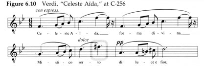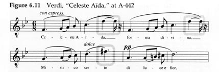 | Figure 6.11 shows that A-442 forces all F naturals into the high register, making the three first phrases monotonous. "Mistico serto" should be a major event, in which Radames transforms his idea of Aida; she is not just a beautiful woman, but something higher, a "mystical garland." Here, however, he seems merely fixated on the lady. Verdi's meaning is changed, his poetic intent ruined. |