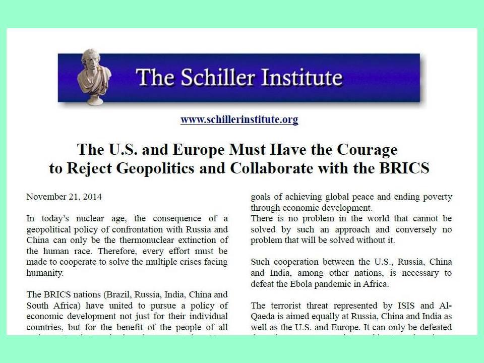 Beginning in November 2014, the Schiller Institute issued a petition titled “The United States and Europe Must Have the Courage to Reject Geopolitics and Collaborate with the BRICS”.