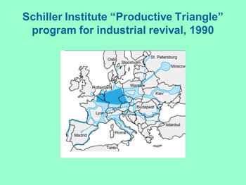 At the same time, LaRouche and the Schiller Institute have a 40-year record of promoting that replacement – starting with what must be done in science and the physical economy, for all countries’ national interests and the common aims of mankind. In the early 1990s, when the Berlin Wall coming down should have meant the end of the Cold War, the Schiller Institute proposed to replace confrontation with collaboration. Its “European Productive Triangle” plan for industrial recovery and its subsequent “Eurasian Land-Bridge” proposal became well-known internationally.