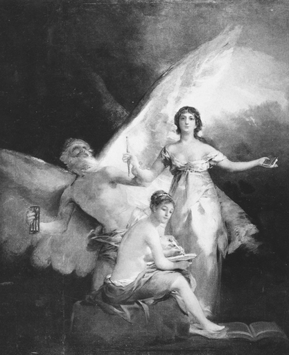 ![]() Figura 3. Francisco Goya y Lucientes, "Alegoría de la Constitución de 1812", 1812-1814. El lenguaje alegórico empleado aquí, se parece al usado durante el período de la Revolución Americana. En el centro se encuentra una hermosa jóven iluminada, que representa la libertad de la nación Española. En su mano izquierda sostiene un pequeño libro de la Constitución de 1812. En su mano derecha sostiene un pequeño cetro. Un anciano barbado la sostiene firmemente del brazo (el Tiempo, con un reloj de arena), y la protege de las tinieblas con sus gigantescas alas. En el primer plano, se encuentra una mujer semidesnuda, que escribe en un fajo de papel. Representa la Historia, cuya tarea es revelar la verdad. |