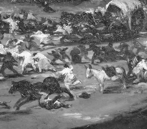 Ante una enorme figura musculosa que se erige en un cielo encumbrado de nubes cargadas de mil truenos, un inmenso bullicio capta nuestra atención. Manadas de vacas en estampida, caballos que tiran a sus jinetes, caravanas que se precipitan en no se sabe qué dirección. Perdidos en un paisaje inquietante, los niños lloran, mientras que los hombres y mujeres huyen. Reina el pánico.