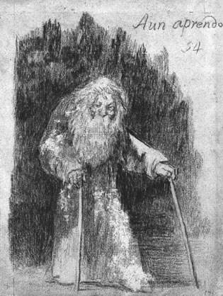 Cuando Goya llegó a Burdeos en 1824 a la edad de 78 años, exploró y dominó la nueva técnica de litografía, dándonos el dibujo de un anciano que camina con la ayuda de dos bastones, con la siguiente leyenda: “Aún aprendo”.