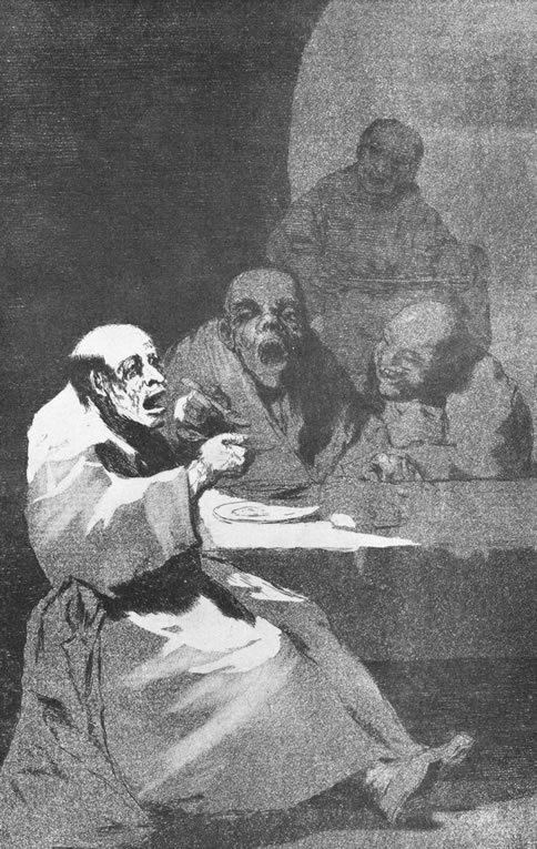 Por ejemplo, en la plancha 13 (Fig.26), nos muestra unos monjes comiendo con cuchara, el título del grabado dice “Están calientes”. Pero, en el dibujo original, el texto escrito a mano es mucho más explícito: “Aquí están los hombres que nos devoran” (anticipando el tema de “Saturno devorando a uno de sus hijos”). Nos encontramos con estos monjes de nuevo en un festín en la plancha 79 (Fig. 27), “Nadie nos ha visto”, y sobre la última de la serie, la plancha 80 (Fig. 28), en plena histeria, con la leyenda “Ya es hora”.