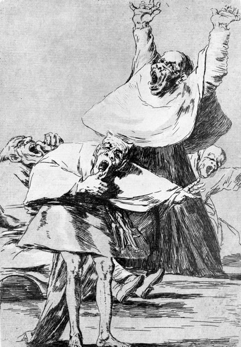 Goya dice en Los desastres, ya no necesitamos la Inquisición (José Bonaparte después la abolió). El propio pueblo, bestializado por una guerra injusta y absurda ahora hace todo! Las denuncias, tortura, garrote, desmembramientos.