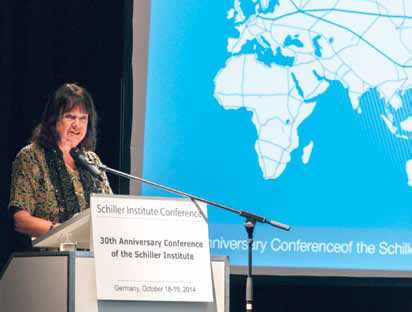 Helga Zepp-LaRouche esbozó los tres peligros mortales que enfrenta la humanidad hoy, y luego retó al público: “Está en nuestras manos: ¿Queremos que haya una humanidad que sea verdaderamente humana?”. |